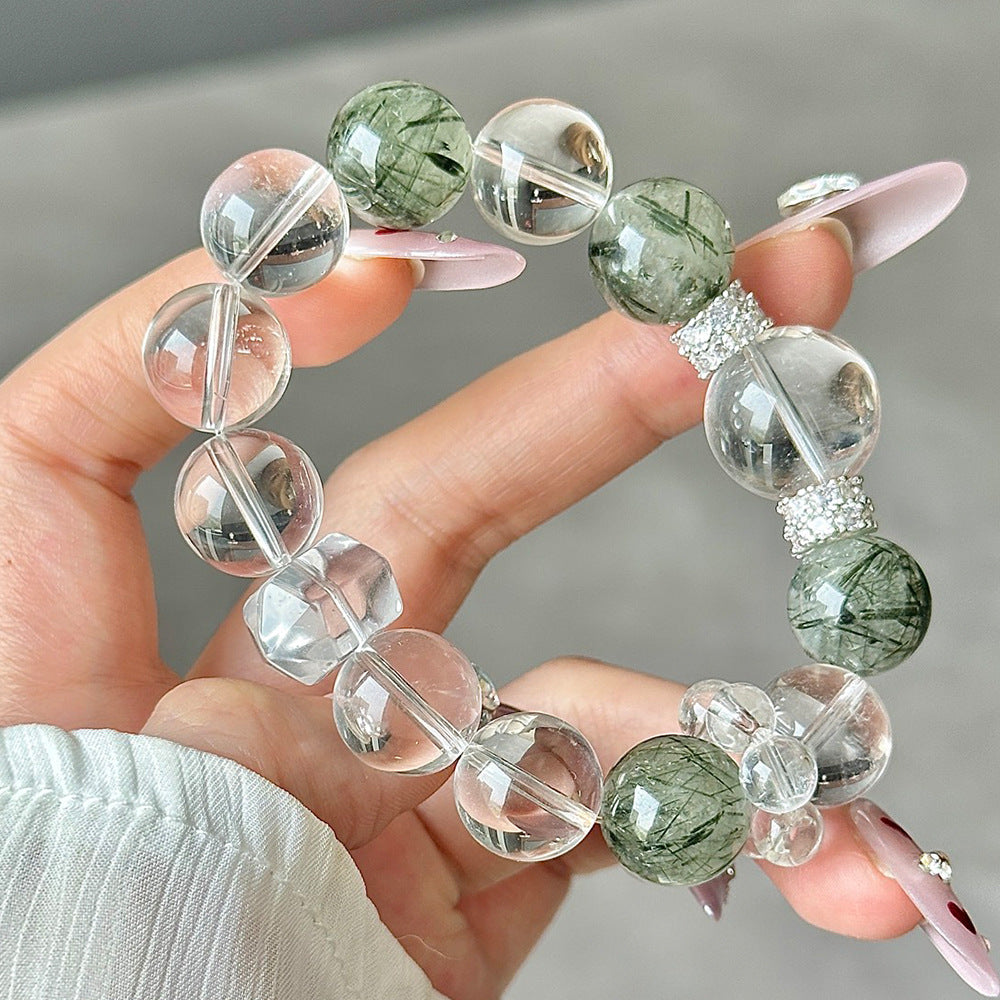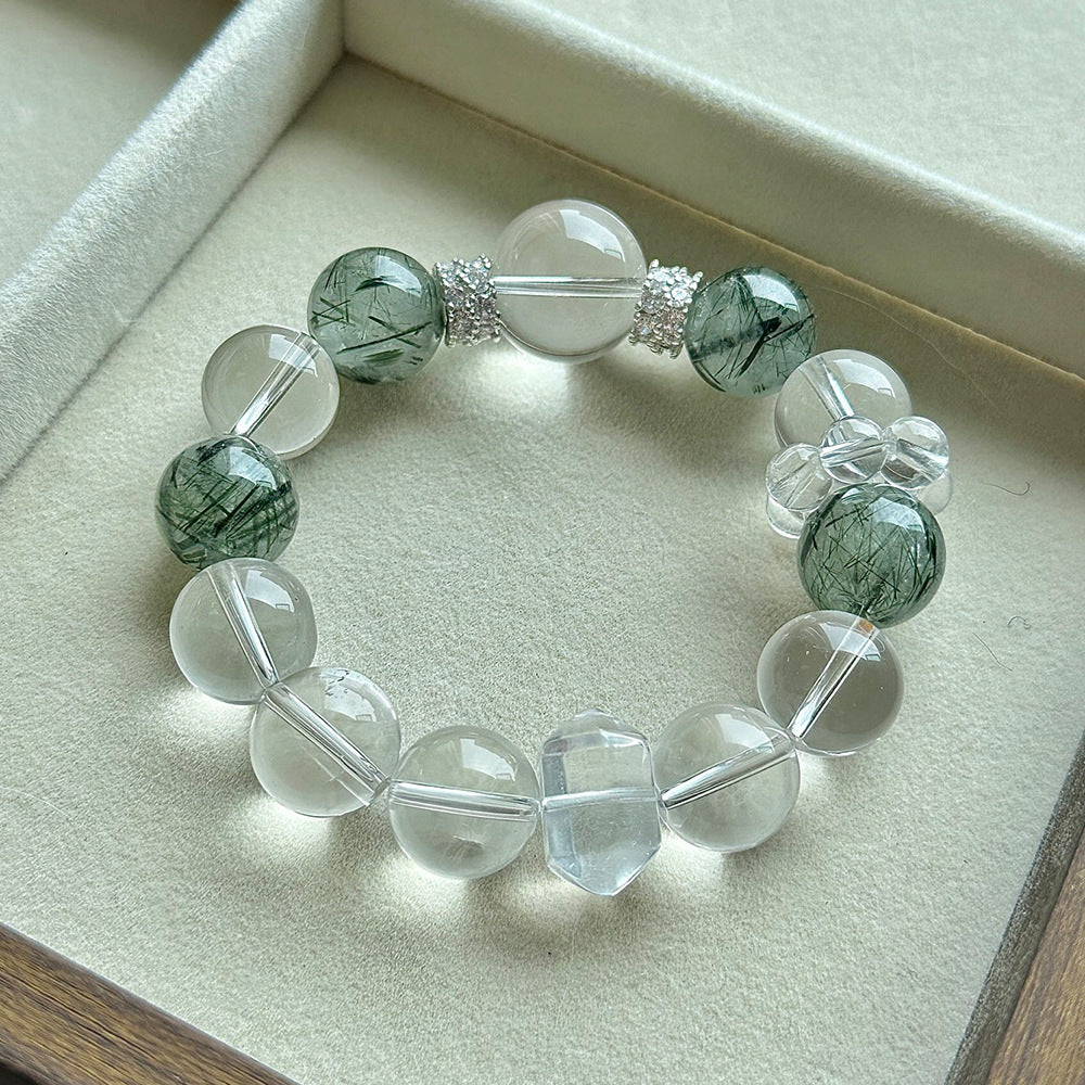 Crystal Oracle 14mm Natural Crystal Bracelet – Green Rutilated Quartz & Clear Quartz Beads | Emotional Healing, Stress Relief & Spiritual Balance