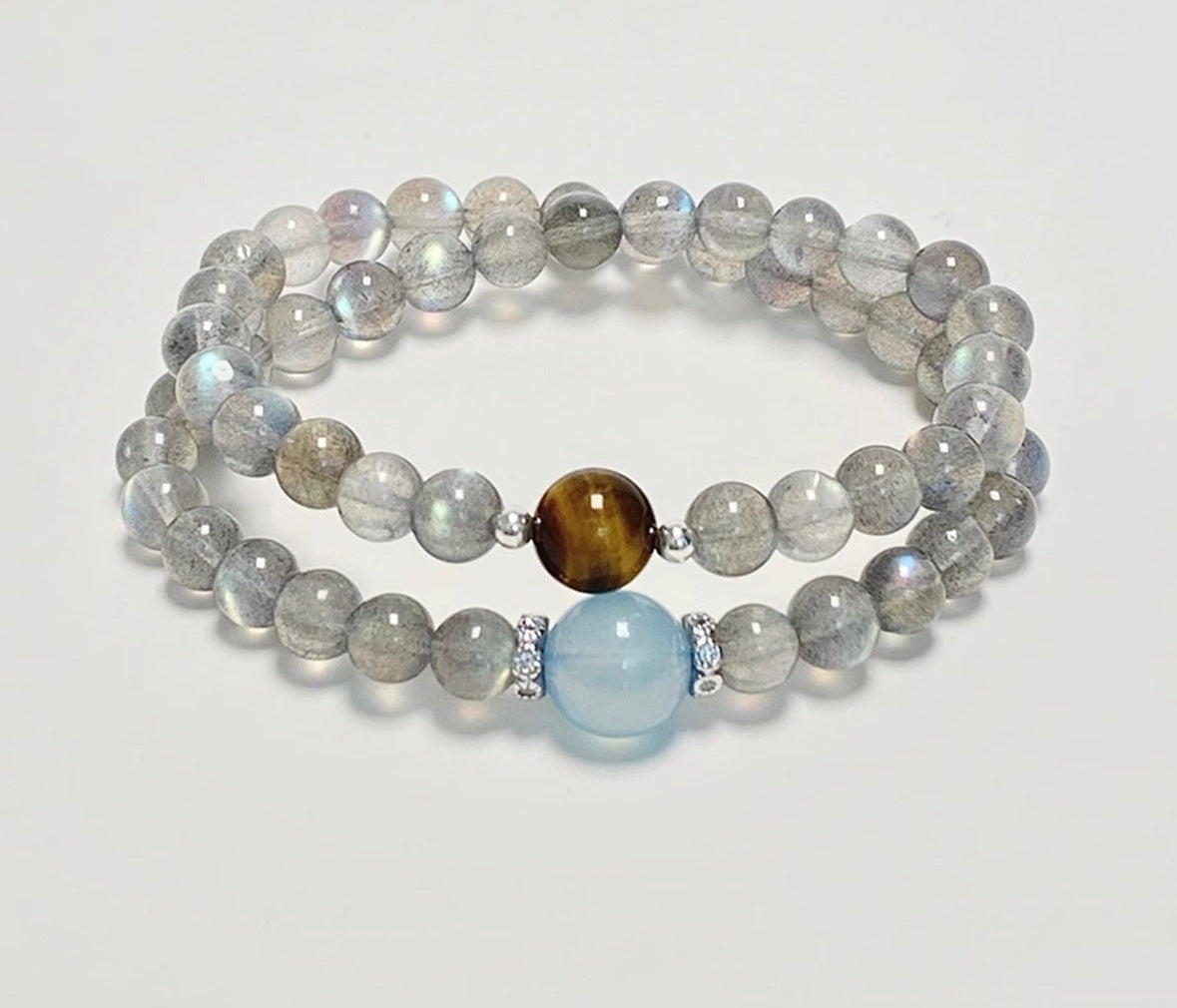 Crystal Oracle Double Strand Moonstone Bracelet with Aquamarine & Tiger's Eye – Natural Gemstones & 925 Silver Accents