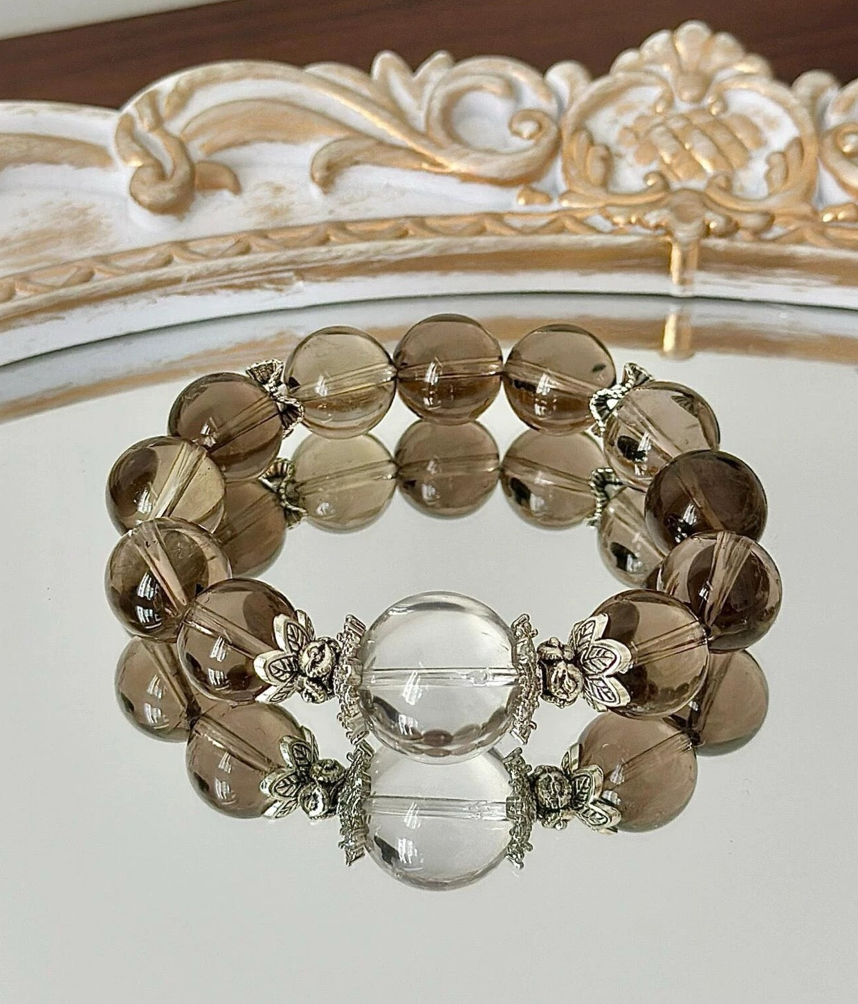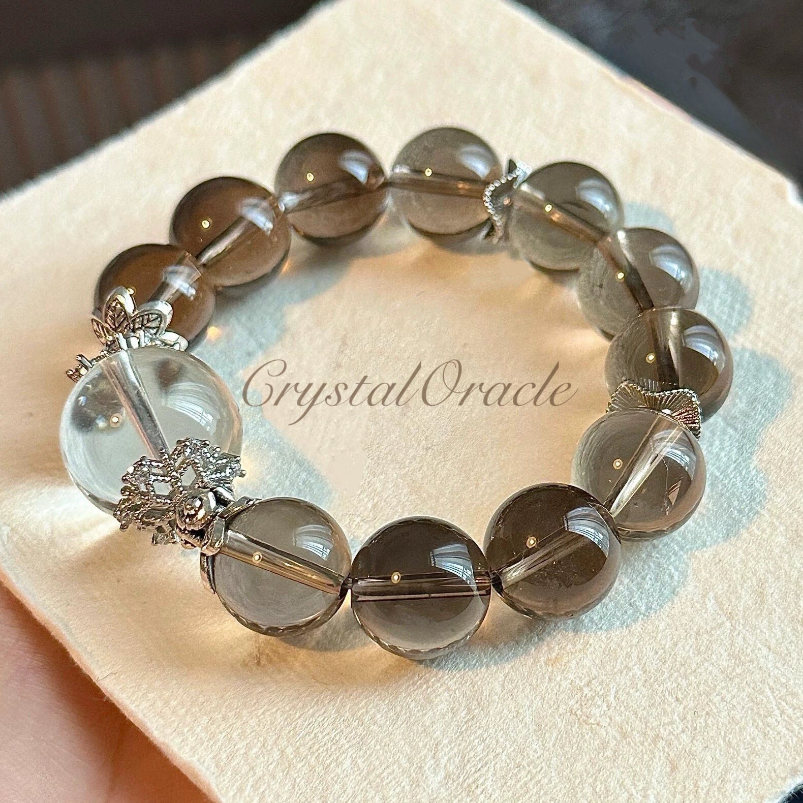 Crystal Oracle Natural 12mm Smoky Quartz Single Strand Bracelet with Clear Quartz Accent – Grounding & Clarity Healing Stones for Stress Relief