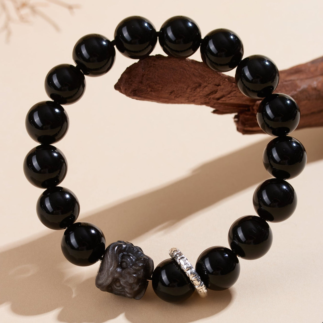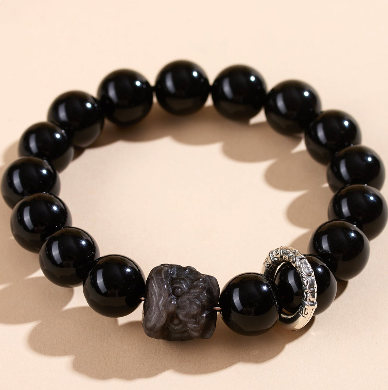 This original design bracelet combines the powerful grounding energy of natural obsidian with the symbolic strength of a hand-carved lion dance bead, accented by sleek silver running rings for both spiritual and aesthetic harmony: